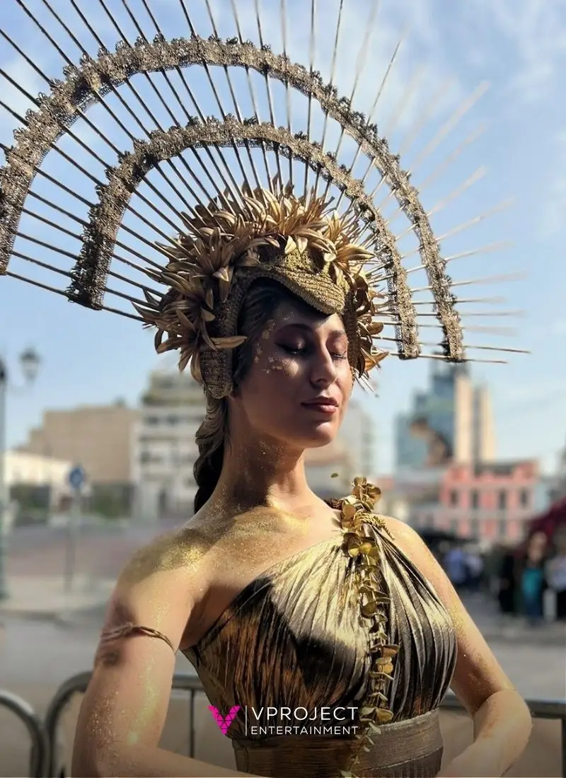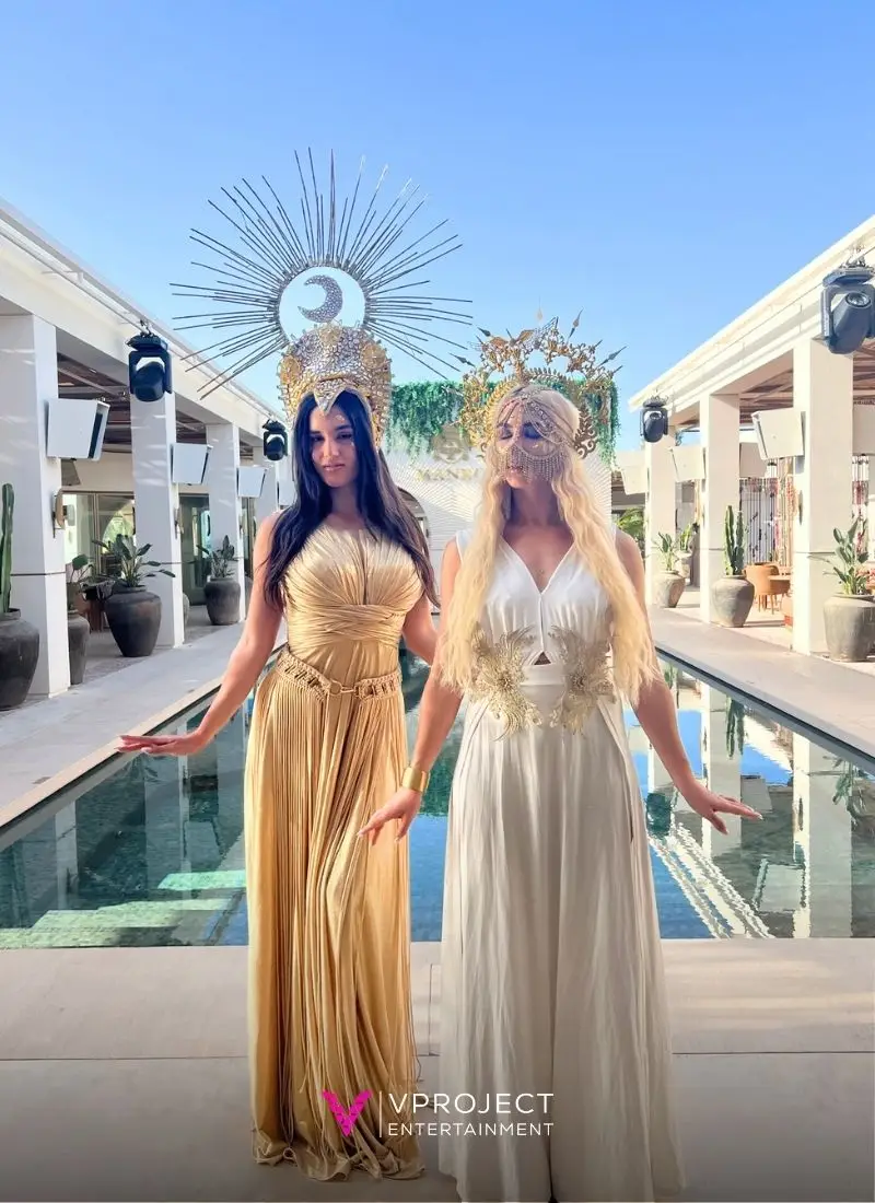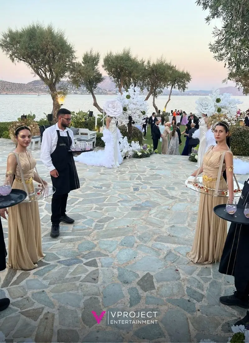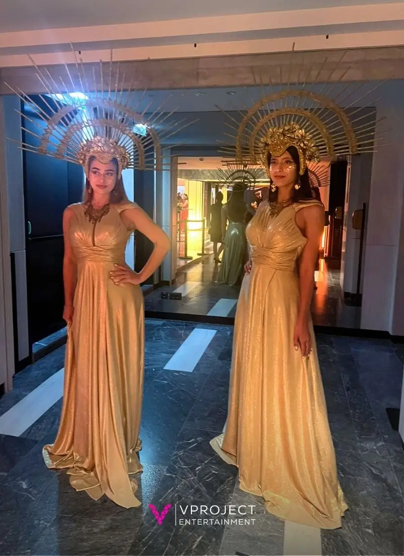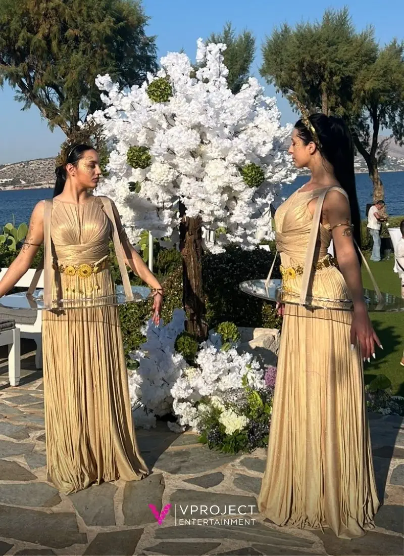 If you’re planning an event in Greece, gold luxury greeters bring instant glamour and atmosphere the moment guests arrive. Styled with Mediterranean flair, golden gowns, striking headpieces, they welcome attendees with grace and elegance. Their warm, poised presence and gentle, ethereal movements create a refined first impression and a memorable photo opportunity. Perfect for entrance receptions, corporate events or wedding openings, these greeters adapt seamlessly to rooftops, villas, resorts or private venues across Greece. They offer a chic, polished welcome that instantly sets the tone for a luxurious and memorable event.